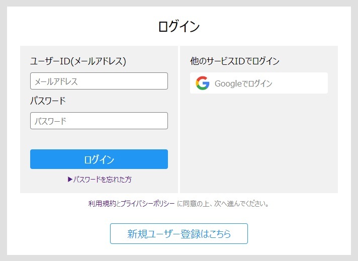 または、他サービス(google)のIDでログインする場合は、“他のサービスIDでログイン”のボタンを選択し、ログインします。