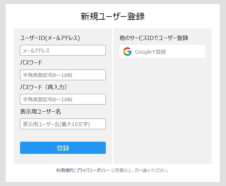 新規ユーザー登録フォームで入力し、認証フローに従い登録を完了させてください。