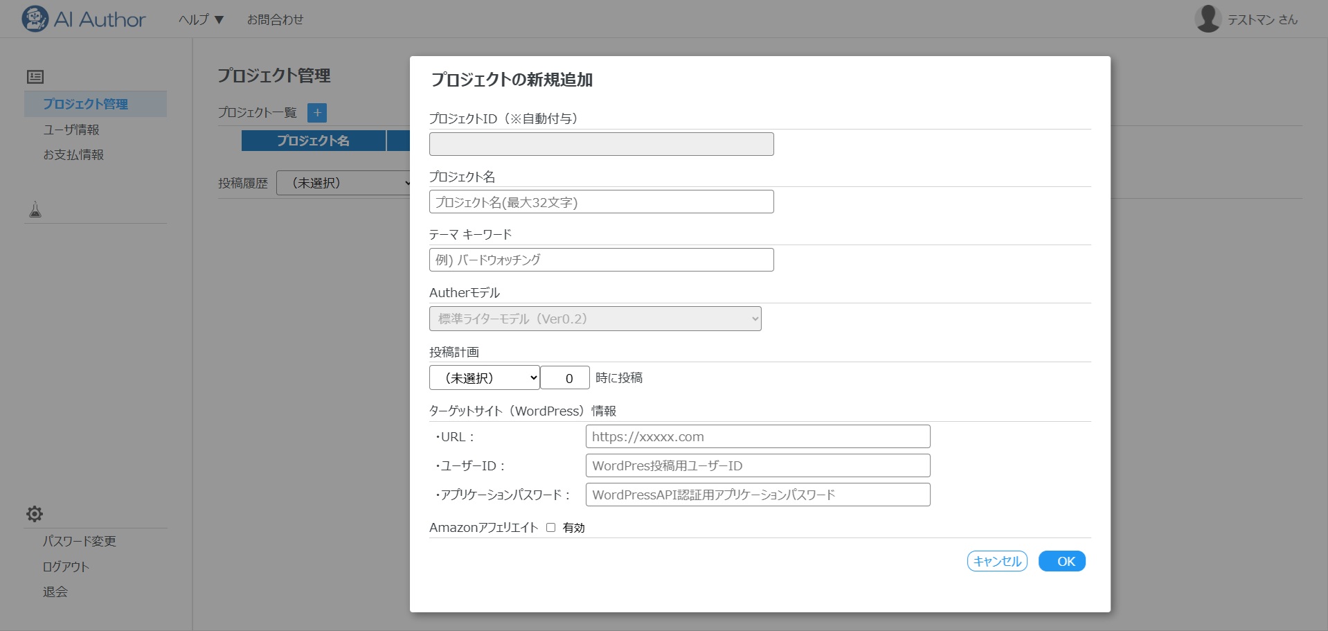 "プロジェクト"は、1つのターゲットWebメディアに対する設定セット(自動で記事を作成するためのテーマワードや記事投稿対象サイトの諸情報)であり、AI Authorの仕事の単位です。