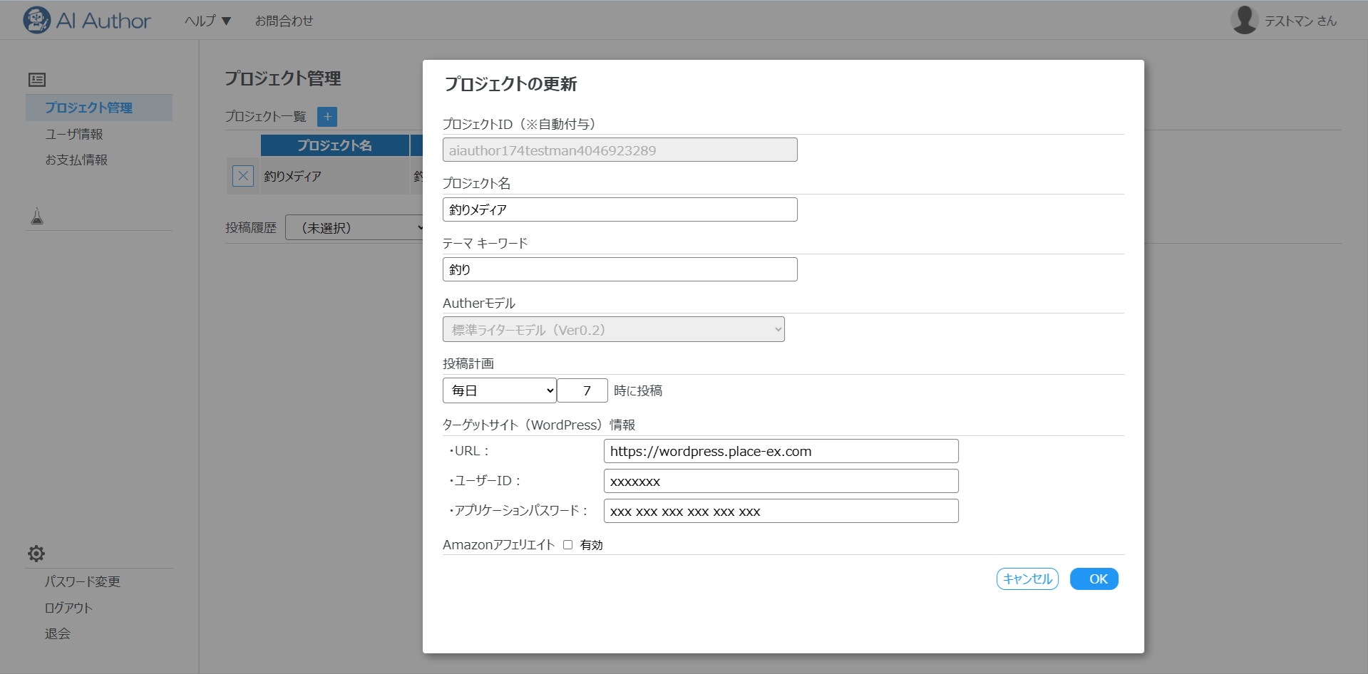 ・ユーザーID:ターゲットサイトのユーザID(AI Authorはこのユーザで記事投稿します)