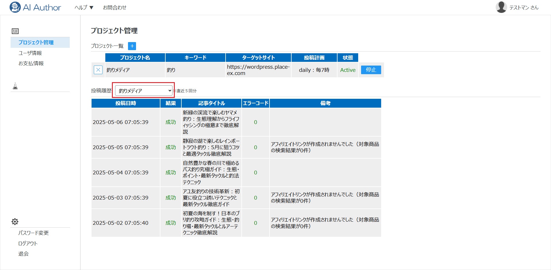 各プロジェクトの稼働状況として投稿履歴を参照できます。ターゲットサイトへの記事投稿がされない状況がある場合は、こちらでエラー情報をご確認いただけます。